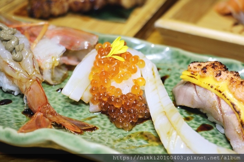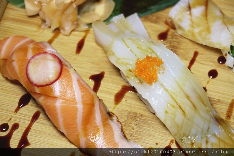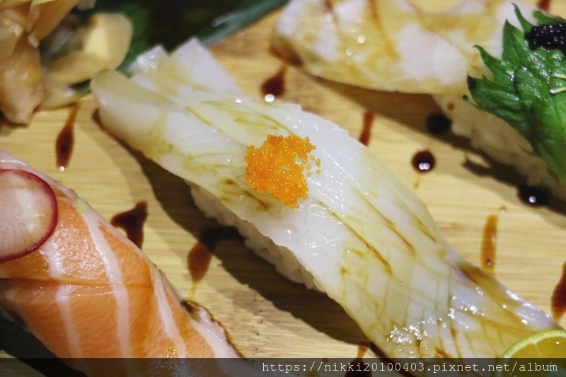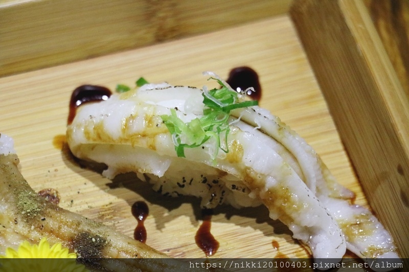 軟絲握壽司,滑嫩甘甜鮮脆的軟絲 一口吃下新鮮的沒話說。