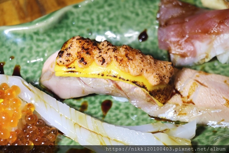 海膽握壽司,新鮮的海膽和醋飯搭配, 滿滿的海膽,一口吃下實在是太厲害了! 是品嚐高級海膽最棒好滋味。