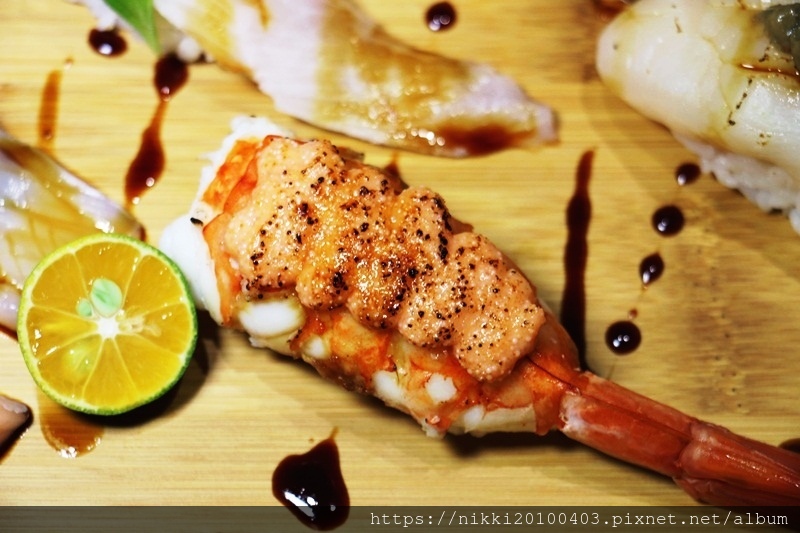 炙燒明太子甜蝦握壽司,炙燒明太子鹹香的滋味和鮮蝦搭配,讓大海的鮮味更佳濃厚。