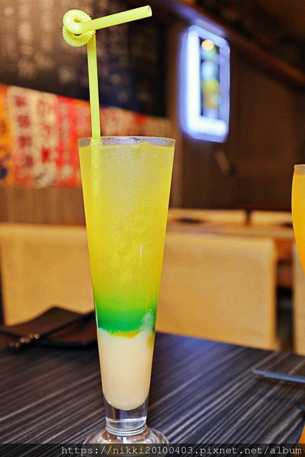 居酒屋的餐點搭配上蜂蜜綠茶、風味氣泡飲,都有解膩的效果,尤其是這華麗的氣泡飲,拍起來是好看又好喝喔。