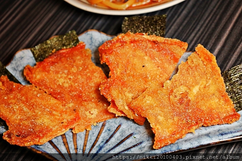 台式的雞皮炸得非常酥脆、完全沒有油膩感,味道吃起來很濃郁,搭配上口感酥脆的海苔,熱熱吃的超棒,在口中可以感受到極端酥脆的口感,也是一道非常有創意的料理。