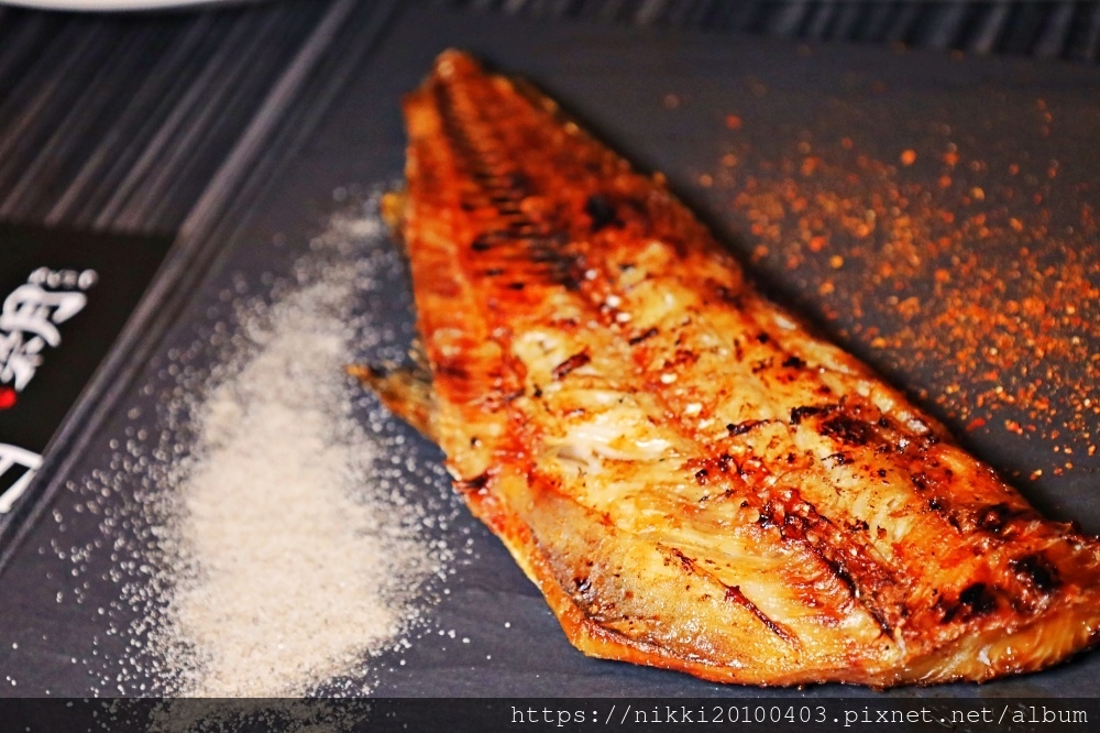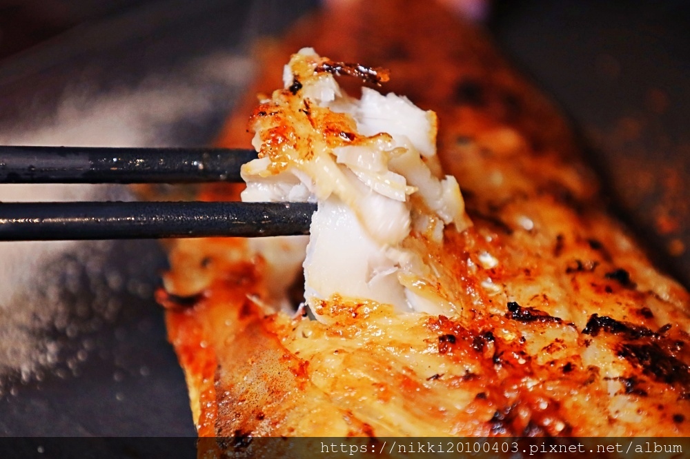 一撥開裡面的肉質非常細膩, 細緻的魚肉還富有彈性, 可以先品嚐一口原味, 第二種吃法可以沾上旁邊的胡椒鹽, 新鮮的縞花魚配上酒類都很合拍。