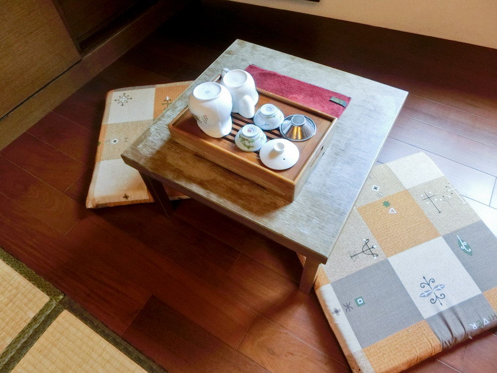 在寧靜的夜晚裡,慵懶愜意地坐在軟墊上泡茶聊天,非常放鬆